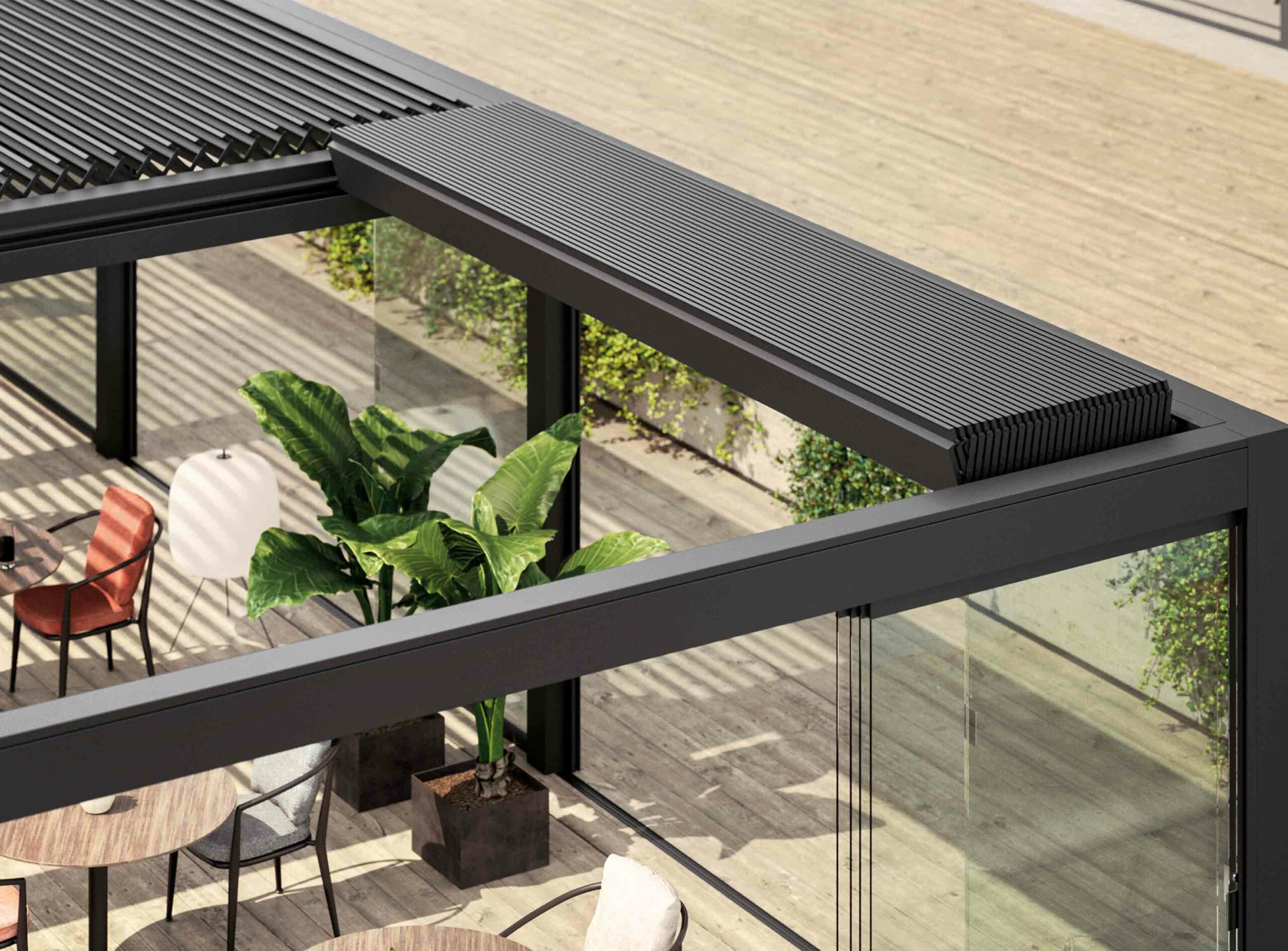 La Brera S ofrece una experiencia exterior completa gracias a la posibilidad de incorporar toldos verticales, cerramientos de cristal, iluminación LED integrada y sistemas domóticos, creando un ambiente confortable y elegante durante todo el año.